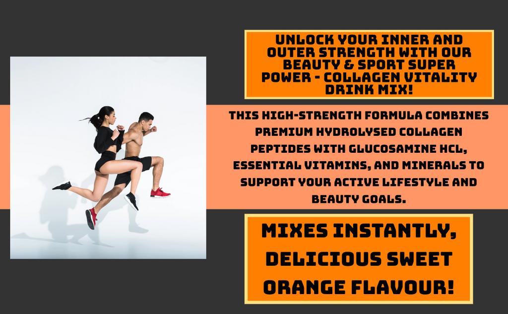 Unlock your inner and outer strength with our delicious Sweet Orange Collagen Vitality drink mix! This high-strength formula combines premium hydrolysed collagen peptides with Glucosamine HCl, essential vitamins, and minerals to support your active lifestyle and beauty goals.