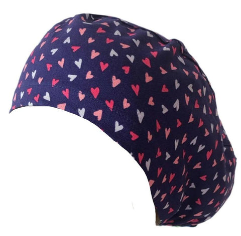 Long Hair Surgical Cap with Elastic Band - Navy Blue Hearts