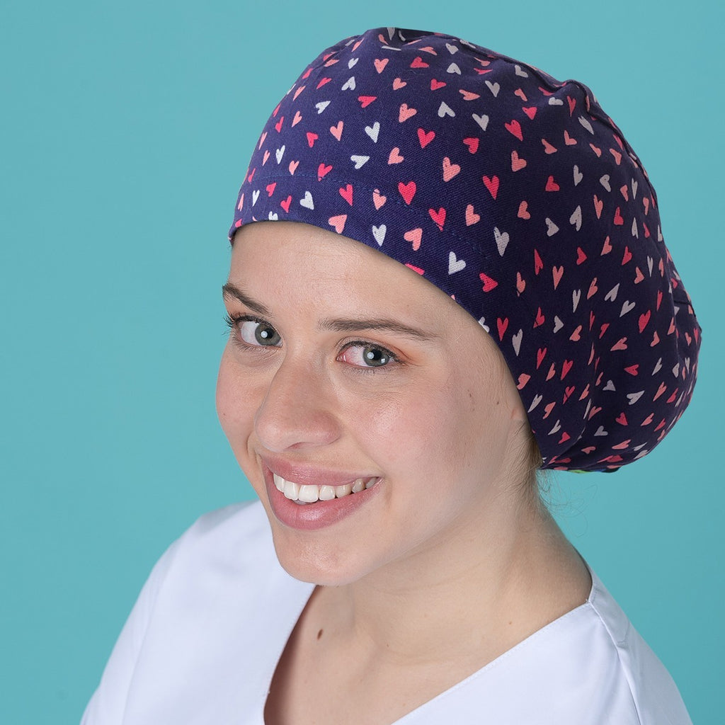 This surgical cap is specifically designed for individuals with long hair, featuring an elastic band at the back for a comfortable fit. The coloured hearts in navy blue design add a touch of style to this functional product.