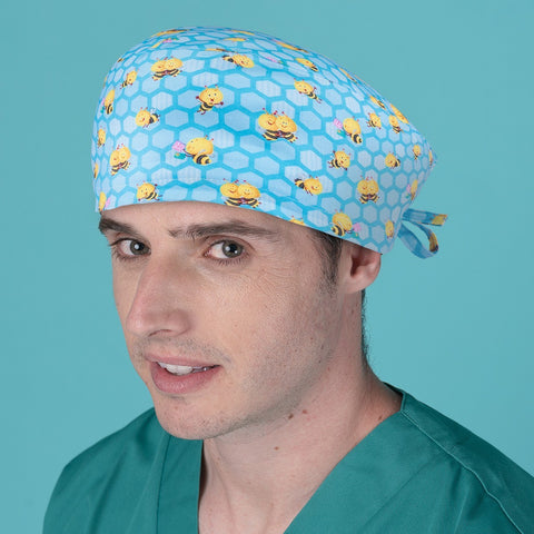This surgical cap features adjustable laces and printed with coloured with bees in blue, perfect for those with shorter hair. The back ribbons add an extra touch of style and function.