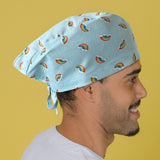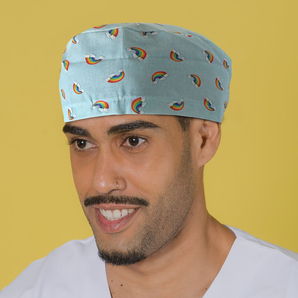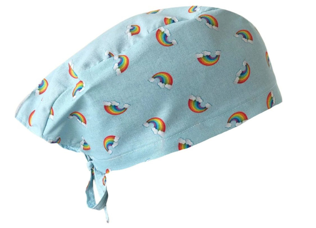 This surgical cap features adjustable laces and printed with rainbow in blue, perfect for those with shorter hair. The back ribbons add an extra touch of style and function.