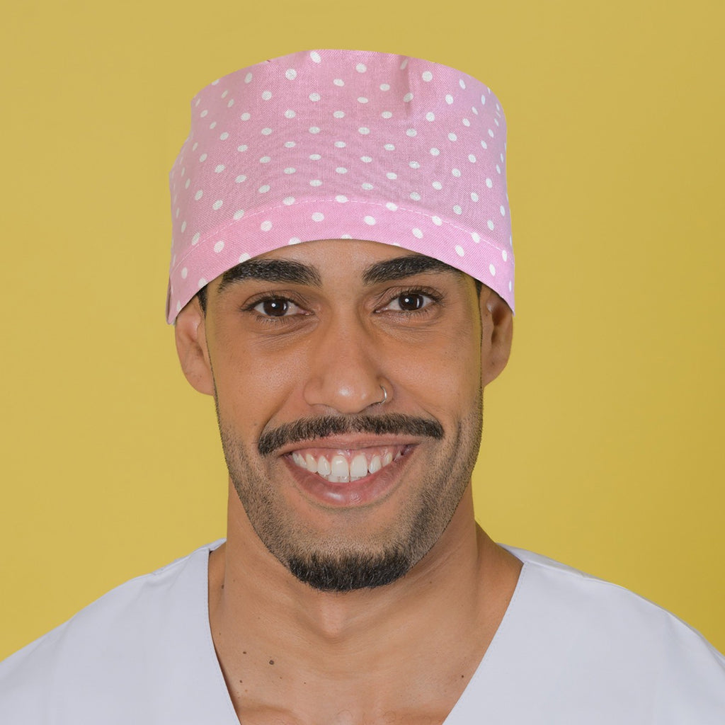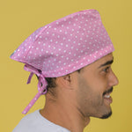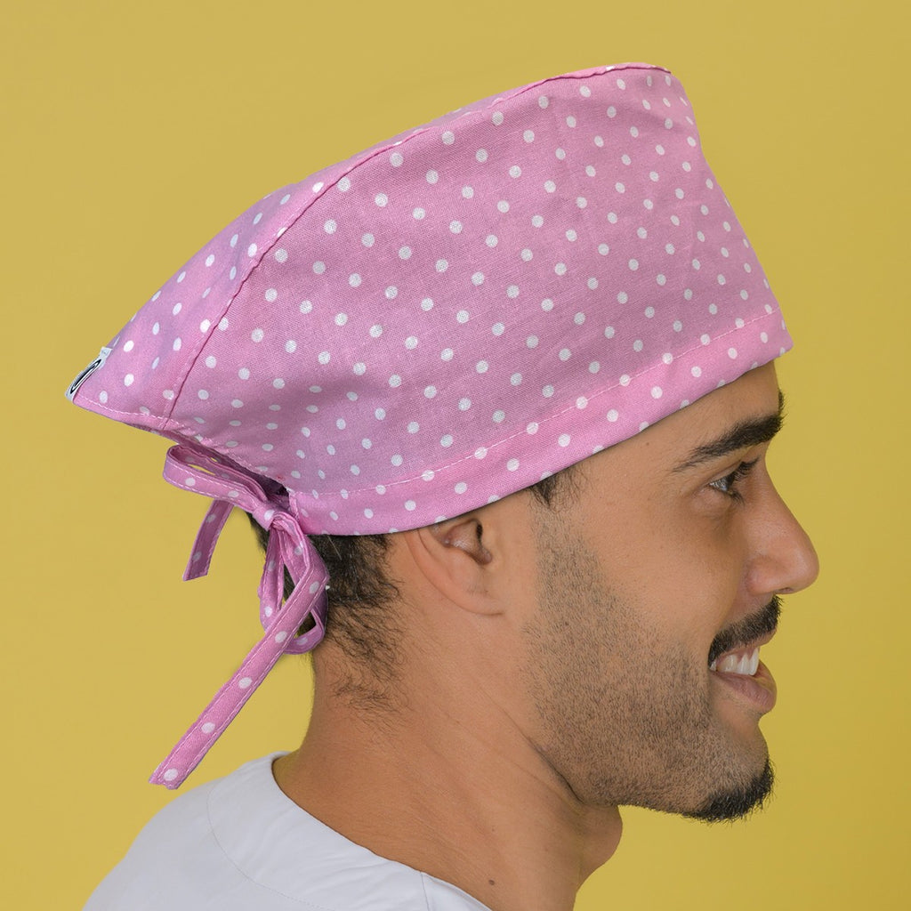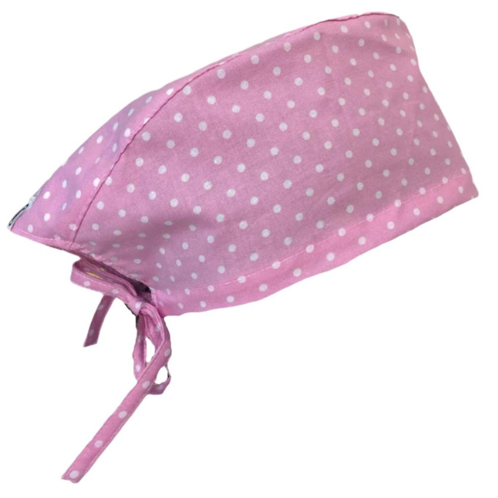 This surgical cap features adjustable laces and printed with dots in pink, perfect for those with shorter hair. The back ribbons add an extra touch of style and function.