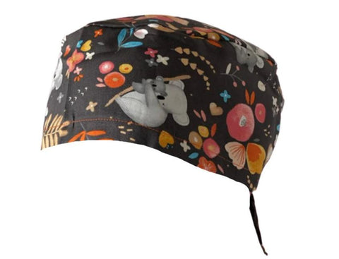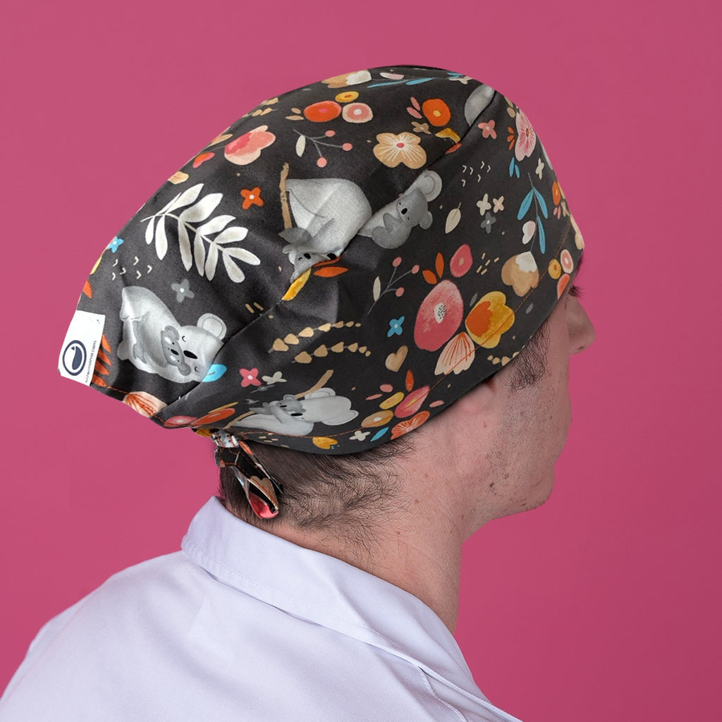 This surgical cap features adjustable laces and printed with grey koala, perfect for those with shorter hair. The back ribbons add an extra touch of style and function.