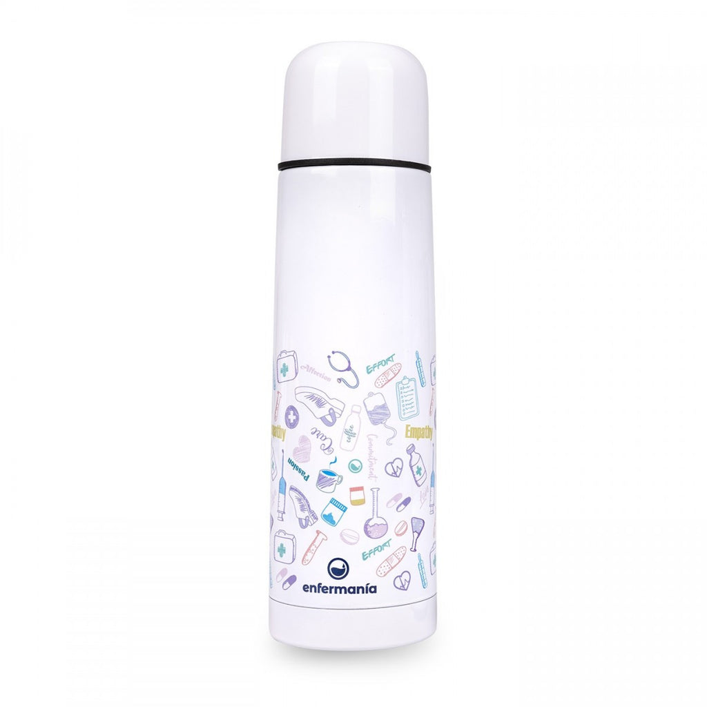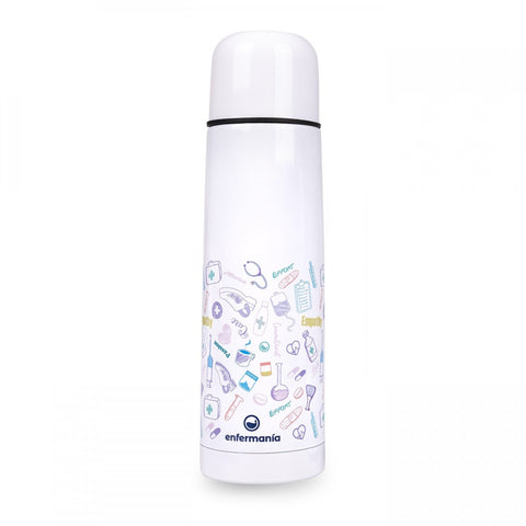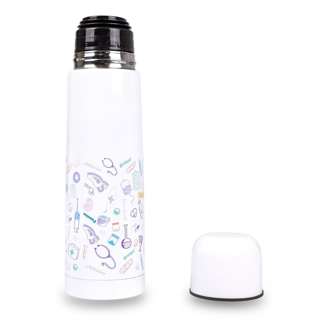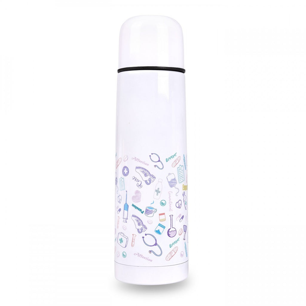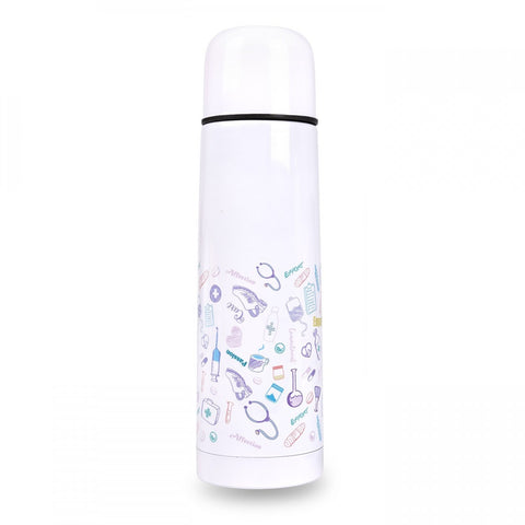 The Reusable Stainless Steel Bottle with Cap in White Purple is a part of the White Purple Care Collection, and features a cute nurse print.