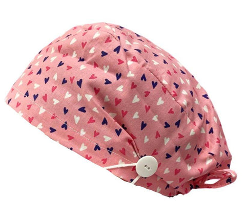 Short Hair Surgical Cap with with Buttons and Adjustable Laces - Strawberry Hearts