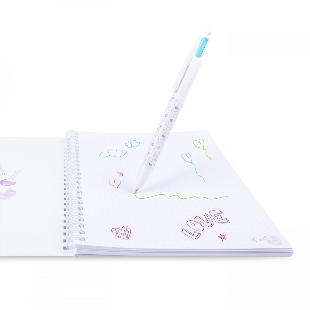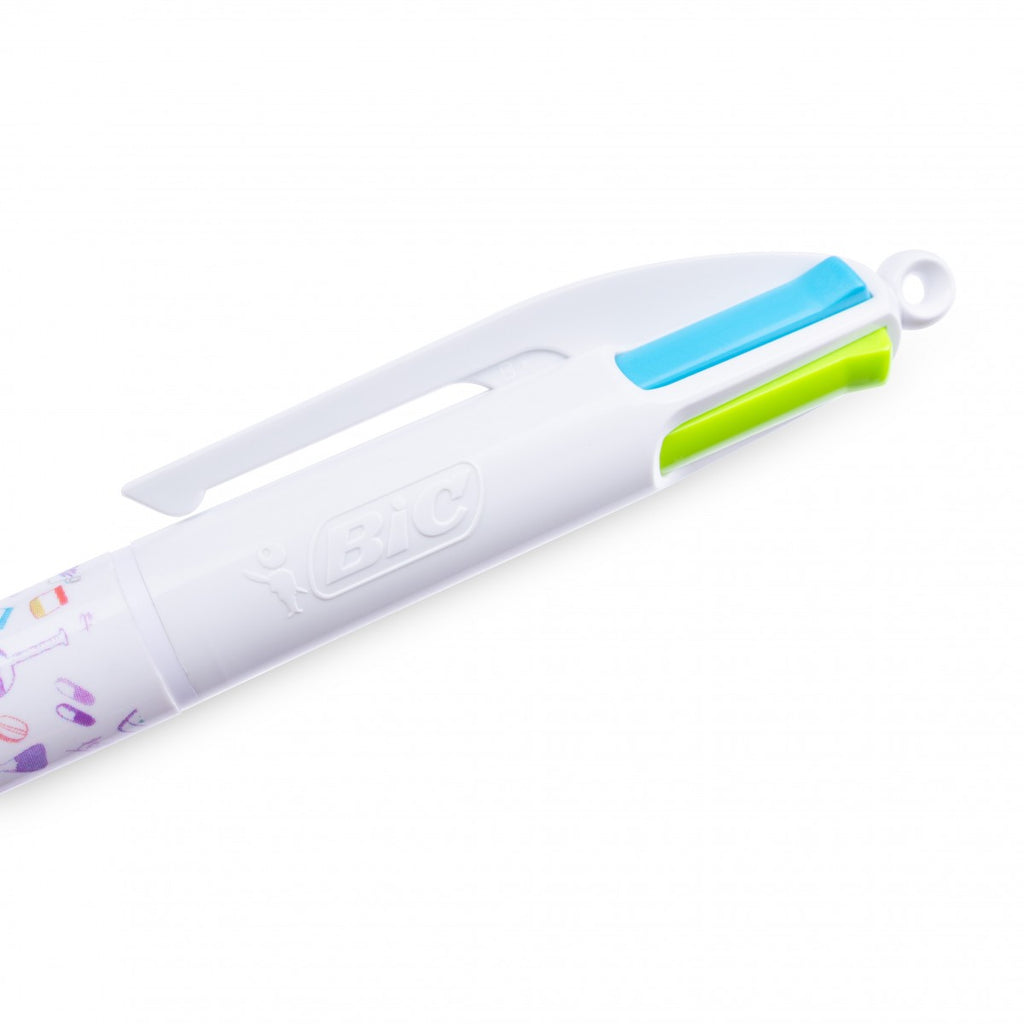 The 4 Color Ballpoint BIC Pen White Purple from the White Purple Care Collection features a convenient upper ring for hanging and comes with violet, fuchsia, green, and blue ink options.