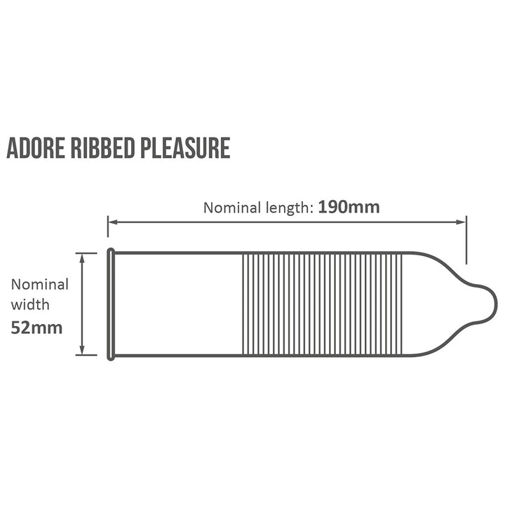 Adore Ribbed Pleasure Condoms are designed to intensify pleasure during sexual encounters. With a nominal width of 52 mm and made from natural rubber latex, these condoms provide a regular fit that is both safe and comfortable. They are lightly lubricated with a non-spermicidal lubricant, and for extra lubrication, Adore recommends a water-based lube to reduce friction and increase satisfaction. The condoms feature ribs along their length and have parallel walls with a teat-end and natural colouring. All Adore condoms are fitted with the BSI and CE Kitemark for quality assurance.