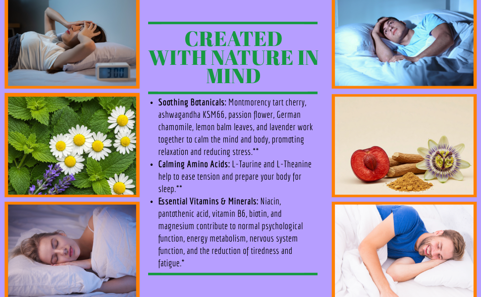 • Soothing Botanicals: Montmorency tart cherry, ashwagandha KSM66, passion flower, German chamomile, lemon balm leaves, and lavender work together to calm the mind and body, promoting relaxation and reducing stress.**
