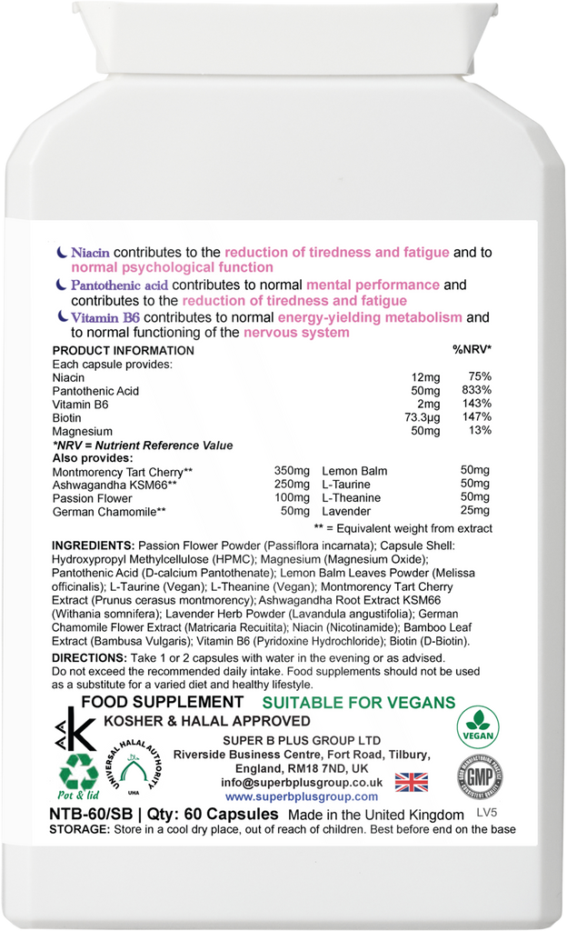 INGREDIENTS: Passion Flower Powder (Passiflora incarnata); Capsule Shell: Hydroxypropyl Methylcellulose (HPMC); Magnesium (Magnesium Oxide); Pantothenic Acid (D-calcium Pantothenate); Lemon Balm Leaves Powder (Melissa officinalis); L-Taurine (Vegan); L-Tyrosine (Vegan); Montmorency Tart Cherry Extract (Prunus cerasus montmorency); Ashwagandha Root Extract KSM66 (Withania somnifera); Lavender Herb Powder (Lavandula angustifolia); German Chamomile Flower Extract (Matricaria Recuitita); Niacin (Nicotinamide); Bamboo Leaf Extract (Bambusa Vulgaris); Vitamin B6 (Pyridoxine Hydrochloride); Biotin (D-Biotin).