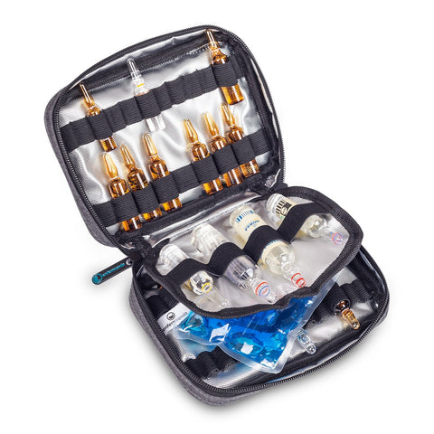 • This case has a capacity of 20 small ampoules and 16 medium ampoules.The inner flap is equipped with 7 wide rubber bands, suitable for larger ampoules.