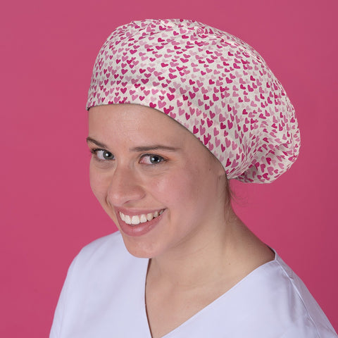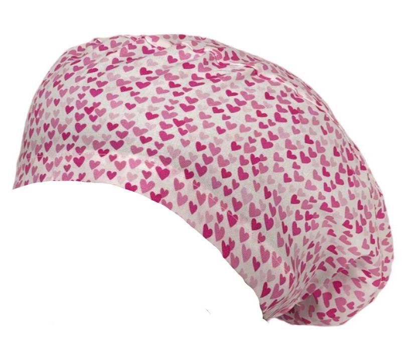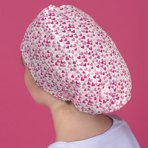 This surgical cap is specifically designed for individuals with long hair, featuring an elastic band at the back for a comfortable fit. The hearts on white design add a touch of style to this functional product.