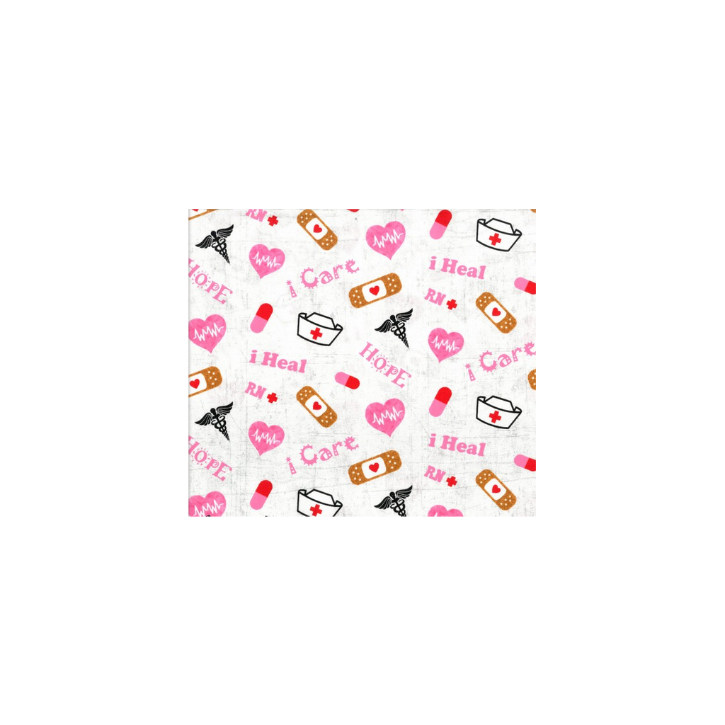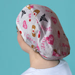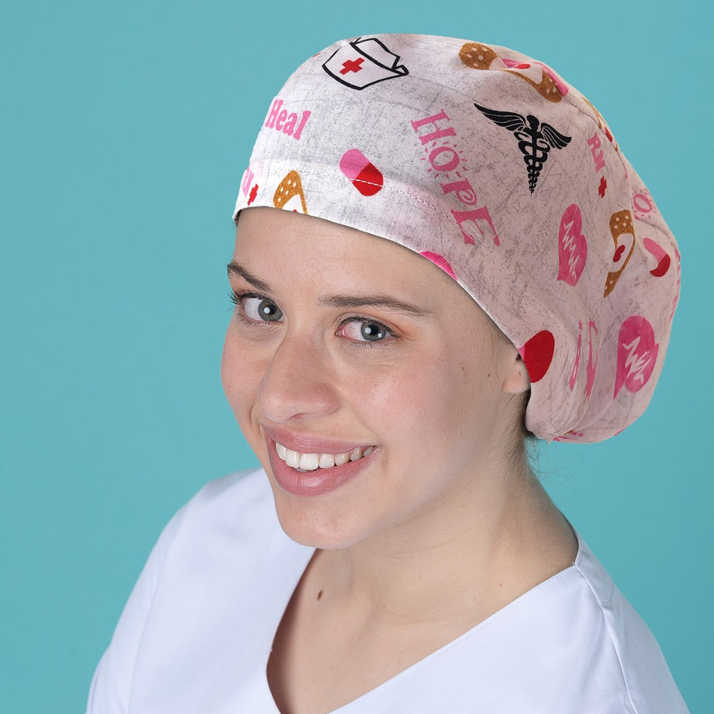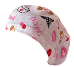 This surgical cap is specifically designed for individuals with long hair, featuring an elastic band at the back for a comfortable fit. The coloured hope, care, nurse cap and plasters design add a touch of style to this functional product.