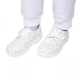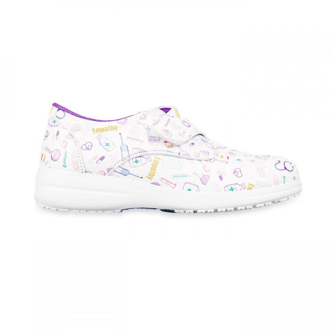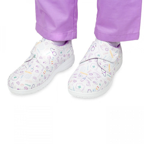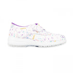 These closed nursing clogs, from the White Purple Care Collection, are made with waterproof vegan leather, are highly breathable, lightweight, and environmentally friendly.