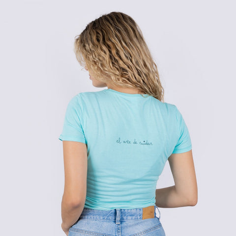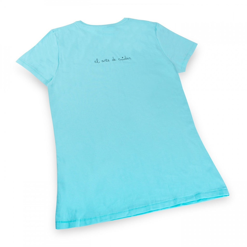 Our Women's Fitted Eco-Friendly T-Shirt features unique prints that can brighten up even the mood of patients. The band-aid design serves as a reminder of the compassionate care our team offers. The joyful expressions on those who wear it, from young ones to adults, can inspire others to aspire to be doctors. The concept of "El arte de cuidar" ("The Art of Caring") represents an artful approach to caring for oneself and others.
