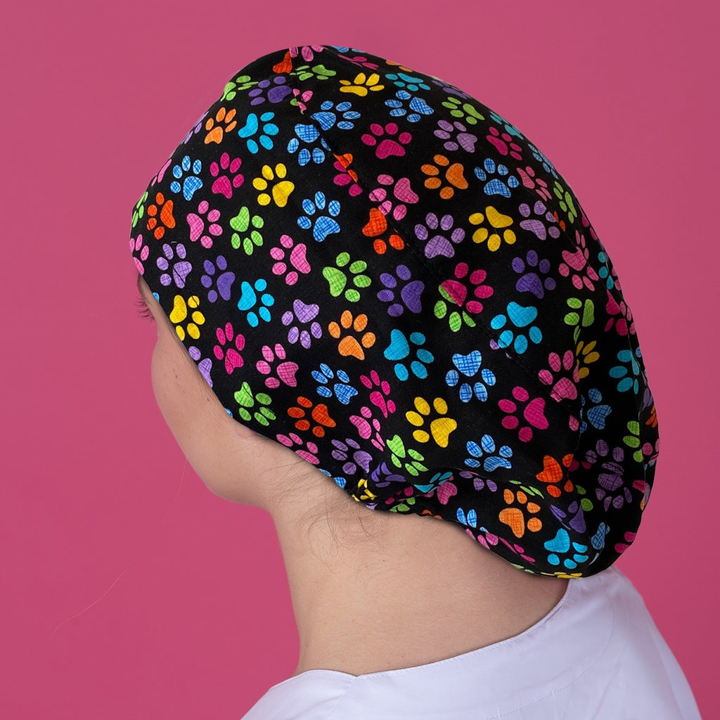 This surgical cap is specifically designed for individuals with long hair, featuring an elastic band at the back for a comfortable fit. The coloured paw print design add a touch of style to this functional product.