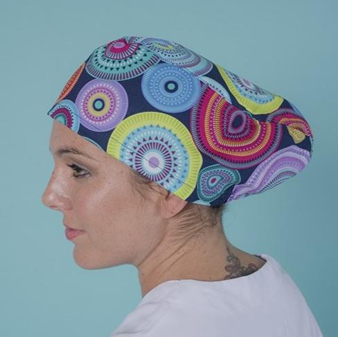 This surgical cap is specifically designed for individuals with long hair, featuring an elastic band at the back for a comfortable fit. The coloured psicodelias add a touch of style to this functional product.