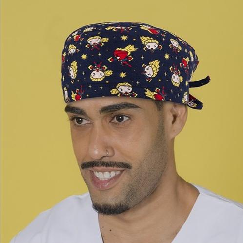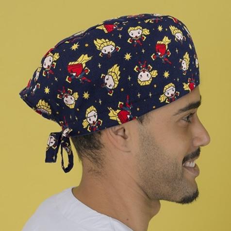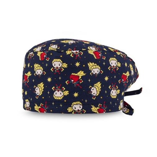 This surgical cap features adjustable laces and printed with Marvel Captain in dark blue, perfect for those with shorter hair. The back ribbons add an extra touch of style and function.