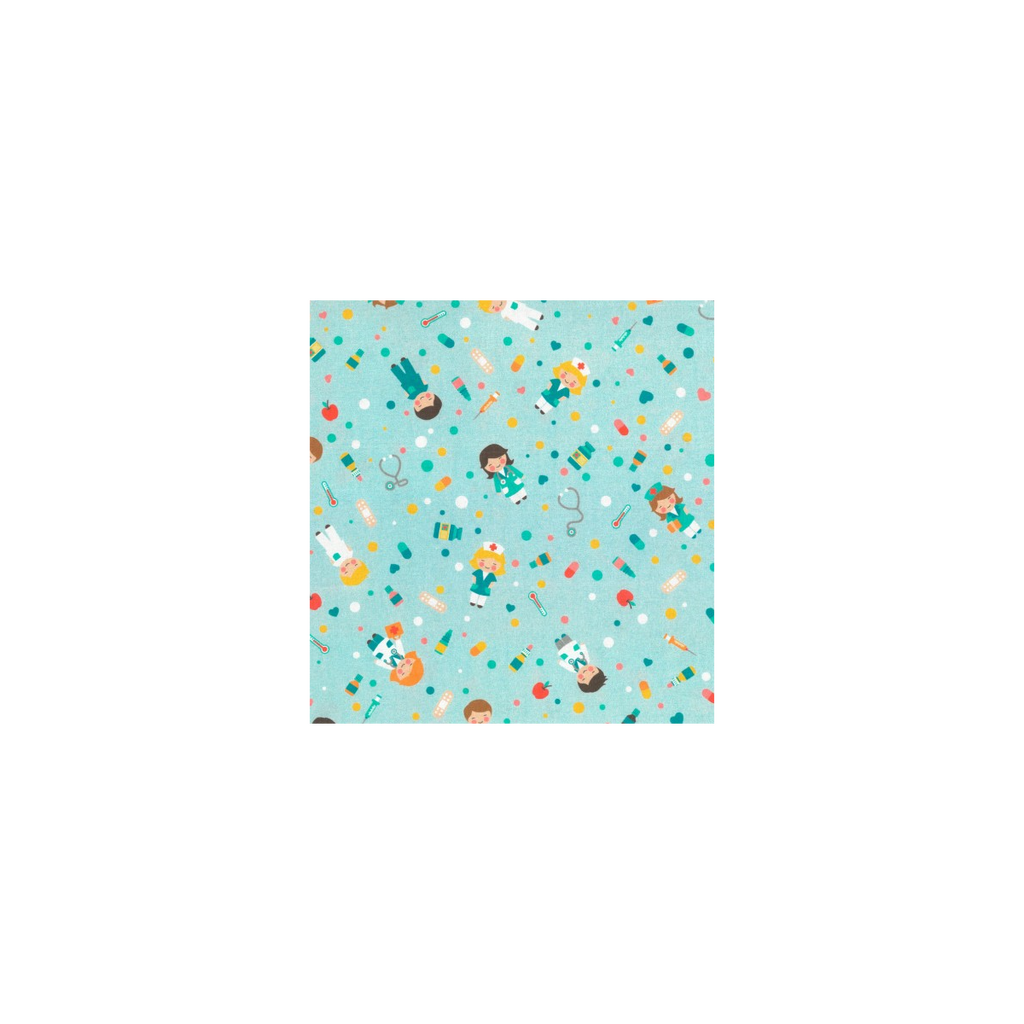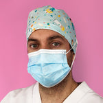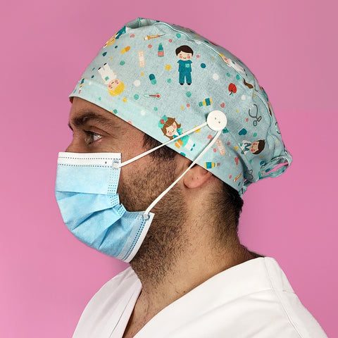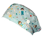 This Short Hair Surgical Cap features Buttons and Adjustable Laces, providing a practical and secure solution for keeping your mask in place. The unique design of coloured nursing care and medical instruments in aqua color adds a touch of style, while the adjustable laces offer both functionality and comfort.