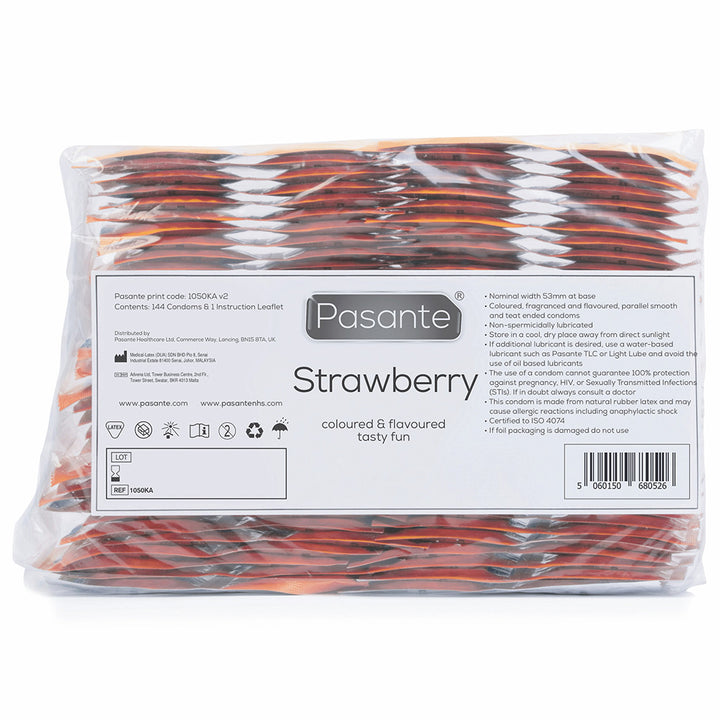 Upgrade your sex life with Pasante Strawberry Condoms. With their sweet aroma and taste, they make an enjoyable sexual experience. These condoms are made from natural rubber latex, and the fruity aroma eliminates the unwanted latex taste and odour. These condoms come in a regular size, 153mm long and 53mm wide, for a comfortable and unrestricted fit. These lightly lubricated condoms are easy to roll on, and additional lube can be added if required. The exceptional silky feel makes them a luxurious addition to sex. Plus, they are vegan-friendly, with no animal-derived ingredients.
