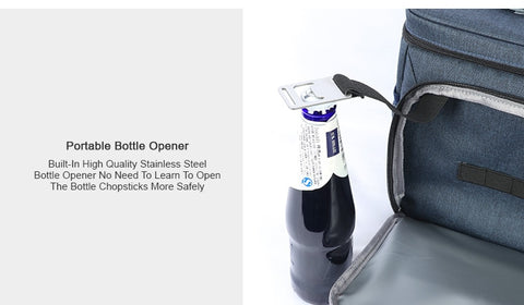 The Shoulder strap has a 3 layer protection that offers dustproof, insulated, and waterproof features. The Creative Opening Design allows for easy access and the Innovative Top Opening makes it more convenient to take drinks on-the-go. It even includes a Built-In High Quality Stainless Steel Bottle Opener for added convenience. With its Large Capacity Design, this shoulder bag is suitable for everyday use and is perfect for traveling with bento boxes and drinks. The Portable Velcro Top floor Openings provide easy access and the Comfortable Soft Shoulder Strap make it a practical option for portable travel.