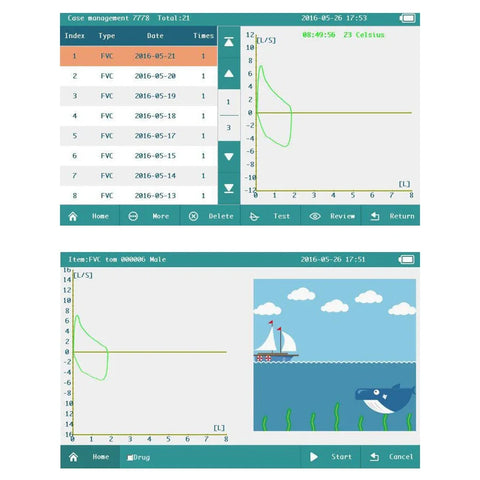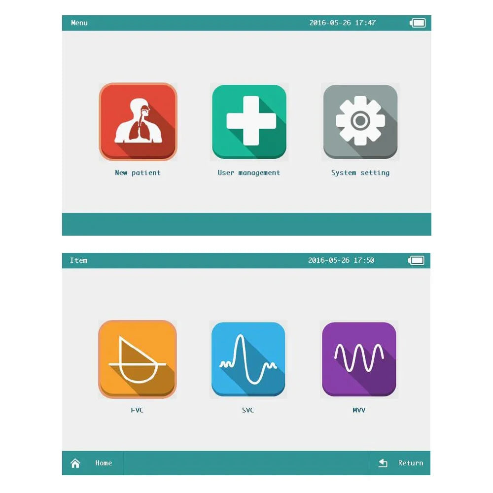 - Real-Time Waveform Display: Features Flow-Volume loop and Volume-Time curve charts on the screen.