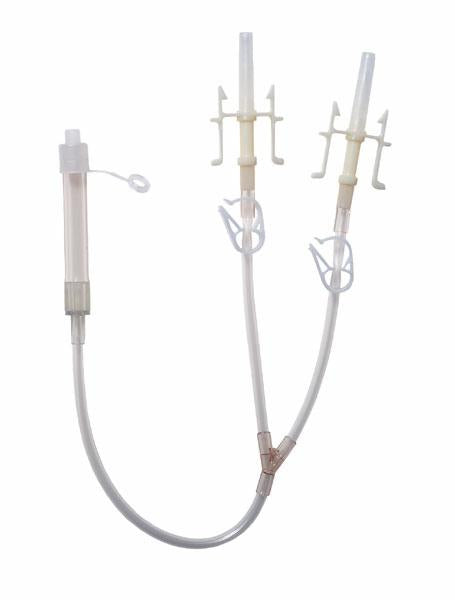 Acid concentrate y-connector with spike, clamp and tubing to enable two acid concentrate bags to be connected.