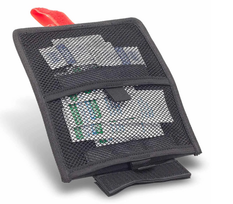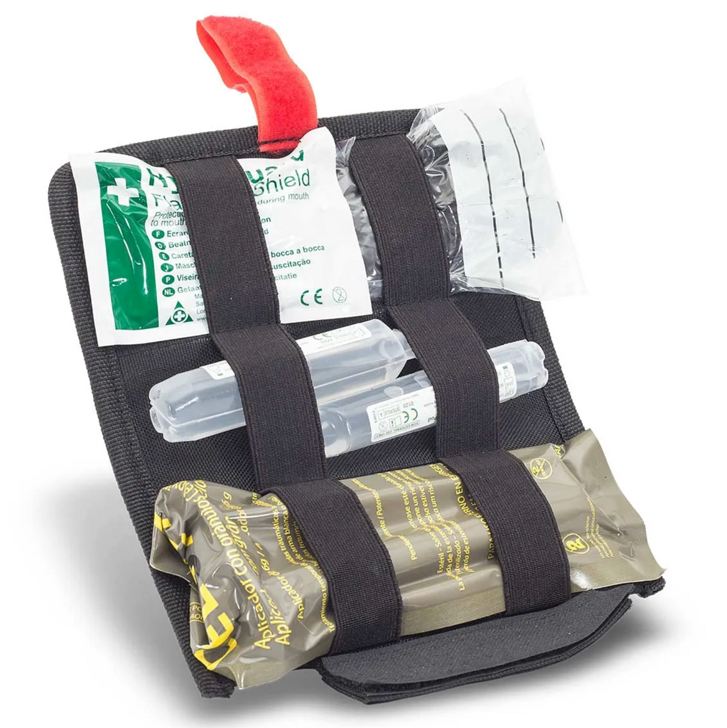 The fast, single pull, full-length front opening flap provides immediate access to all contents. A removable double sided, central storage leaf features both mesh fronted zip pockets on one side, and elasticated loops on the reverse. Internal pockets and loops provide ample storage options for a wide range of emergency first aid materials.