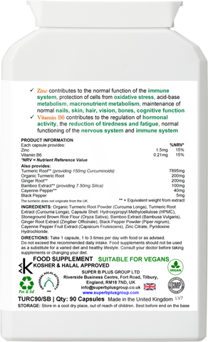 Super Herbal Turmeric Plus Zinc Vitamin B6 Immunity Energy & Brain & Joint Support Vegetarian Vegan Halal Kosher Supplement