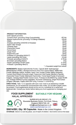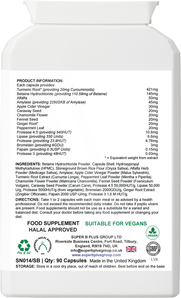 Betaine Hydrochloride Powder, Capsule Shell: Hydroxypropyl Methylcellulose (HPMC), Stoneground Brown Rice Flour (Oryza Sativa), Alfalfa Herb Powder (Medicago Sativa), Amylase, Apple Cider Vinegar Powder (Malus Sylvestris), Turmeric Root Extract (Curcuma Longa), Peppermint Leaf Powder (Mentha x Piperita), Chamomile Flower Powder (Matricaria Chamomilla), Fennel Seed Powder (Foeniculum Vulgare), Caraway Seed Powder (Carum Carvi), Protease 4.5 50,000HUT/g, Lipase 50,000 U/g, Protease 5000HUT/g (from vegetable), Bromelain 2000GDU/g, Ginger Root Extract (Zingiber Officinale), Papain 2000 USP-U/mg, Protease 3 1.6 M HUT/g.