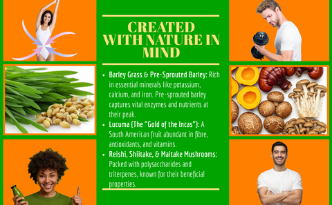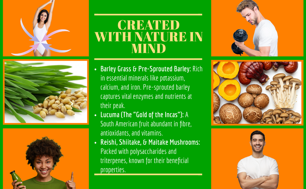 INGREDIENTS (Organic, dried, powdered): Pre-Sprouted Activated BARLEY (Hordeum vulgare), Lucuma (Pouteria lucuma), Linseed (Flaxseed) (Linum usitatissimum), WHEAT Grass (Triticum aestivum), Moringa Leaf (Moringa oleifera), BARLEY Grass Leaf (Hordeum vulgare), Quinoa (Chenopodium quinoa), Acai Berry (Euterpe oleracea), Baobab Fruit Pulp (Adansonia digitata), Kelp (Ascophyllum nodosum), Spirulina (Arthrospira platensis) (SULPHITES*), Turmeric (Curcuma longa), Alfalfa (Medicago sativa), Maca Root (Lepidium meyenii), Acerola Fruit (Malphigia glabra), Almond Mushroom Fruiting Body (Agaricus blazei), Apple (Malus domestica), Asparagus Root (Asparagus racemosus), Beetroot (Beta vulgaris), Bilberry (Vaccinium myrtillus), Black Pepper (Piper nigrum), Blueberry Fruit (Vaccinium spp (cyanococcus)), Broccoli (Brassica oleracea italica), Carrot Root (Daucus carota), Chaga Mushroom Fruiting Body (Inonotus obliquus), Chlorella (broken cell wall) (Chlorella vulgaris) (SULPHITES*), Cordyceps Mushroom Fruiting Body (Ophiocordyceps sinensis), Fennel Seed (Foeniculum vulgare), Green Tea Leaf (Camellia sinensis), Kale (Brassica oleracea acephala), Lion's Mane Mushroom Fruiting Body (Hericium erinaceus), Maitake Mushroom Fruiting Body (Grifola frondosa), Nettle Leaf (Urtica dioica), Olive Leaf (Olea europaea), Parsley Leaf (Petroselinum crispum), Peppermint Leaf (Mentha piperita), Reishi Mushroom Fruiting Body (Ganoderma lucidum), Shiitake Mushroom Fruiting Body (Lentinula edodes), Siberian Ginseng (Eleutherococcus senticosus), Spinach Leaf (Spinacia oleracea).