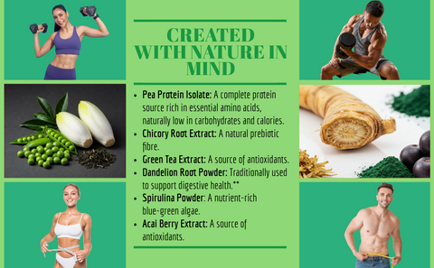 INGREDIENTS: Pea Protein (Pisum sativum) Isolate, Fibre (Chicory Root (Cichorium intybus) Extract), Green Tea Leaf (Camellia Sinensis) Extract, Dandelion Root (Taraxacum officinale) Powder, Spirulina Powder (Arthrospira platensis), Acai Berry (Euterpe Oleracae Martius) Extract, Stabiliser (Xanthan Gum), Sweetener: Stevia Leaf Extract (Steviol glycosides).