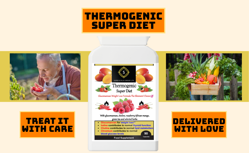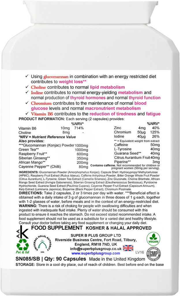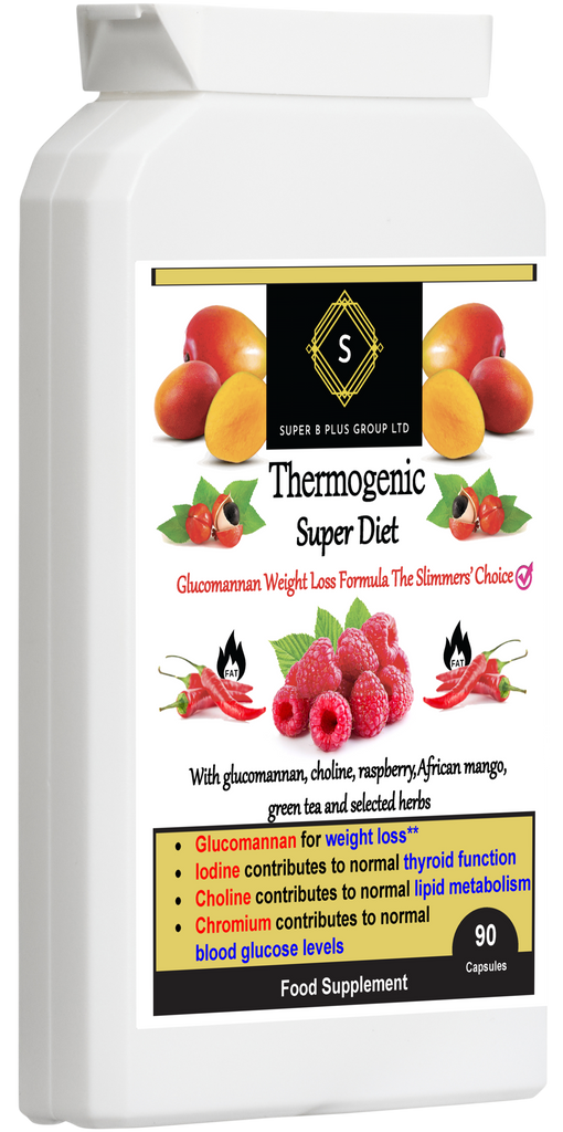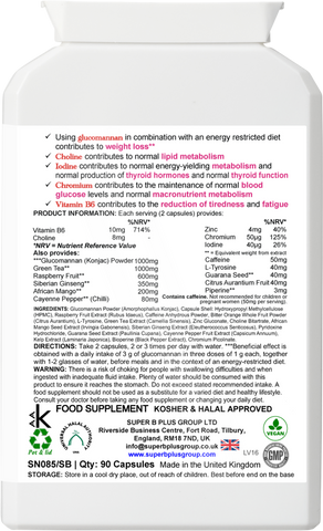 Thermogenic Super Diet is an 'in shape' combination herbal food supplement, meticulously formulated with a specialist blend of synergistic herbs and nutrients. Each capsule combines herbal ingredients with essential vitamins and minerals, including glucomannan (konjac), green tea, Siberian Ginseng, African mango, bitter orange, cayenne pepper, raspberry fruit, caffeine, L-Tyrosine, guarana seed, and piperine, plus vitamin B6, choline, zinc, chromium picolinate, and iodine. Our Thermogenic Super Diet is vegetarian, vegan-friendly, gluten-free, and dairy-free.