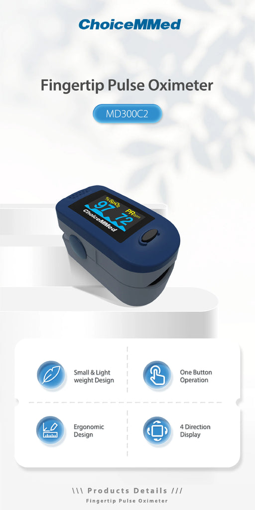 The ChoiceMMed MD300C2 Medical Blood Oxygen Fingertip Pulse Oximeter provides accurate readings of SpO2, pulse rate, and pulse strength for monitoring blood oxygen saturation levels.