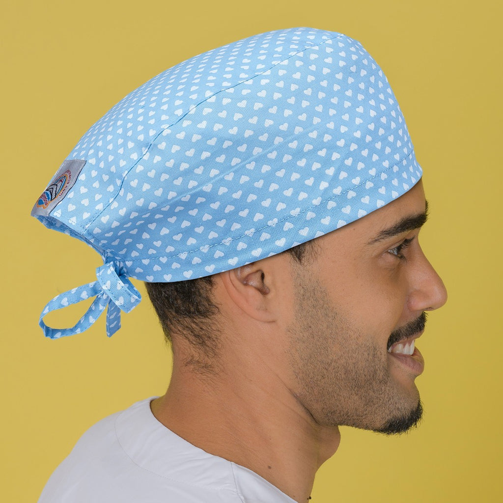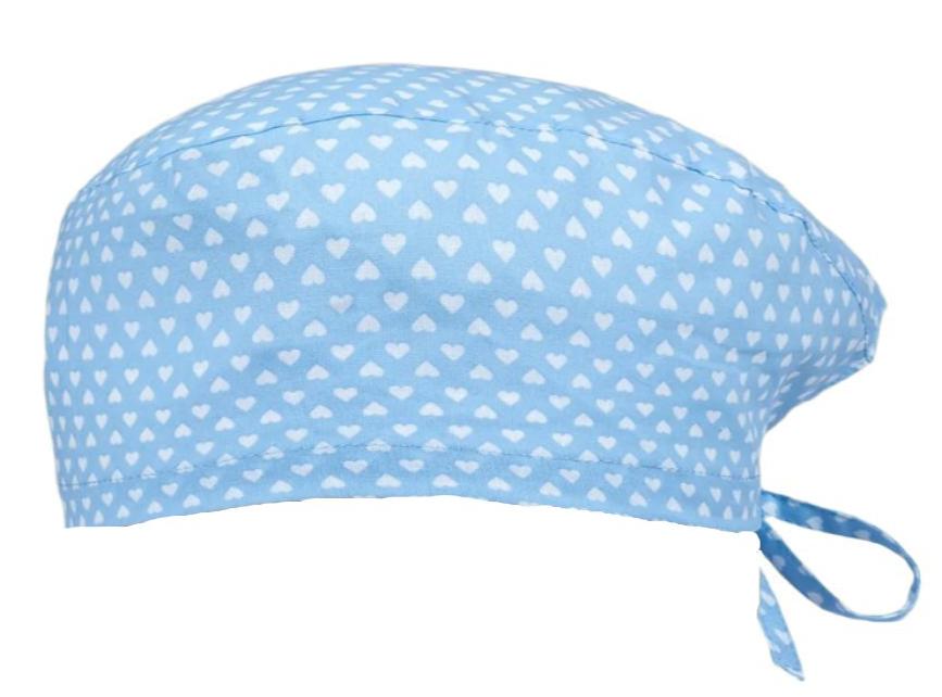 This surgical cap features adjustable laces and printed with hearts on blue, perfect for those with shorter hair. The back ribbons add an extra touch of style and function.