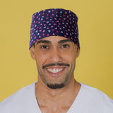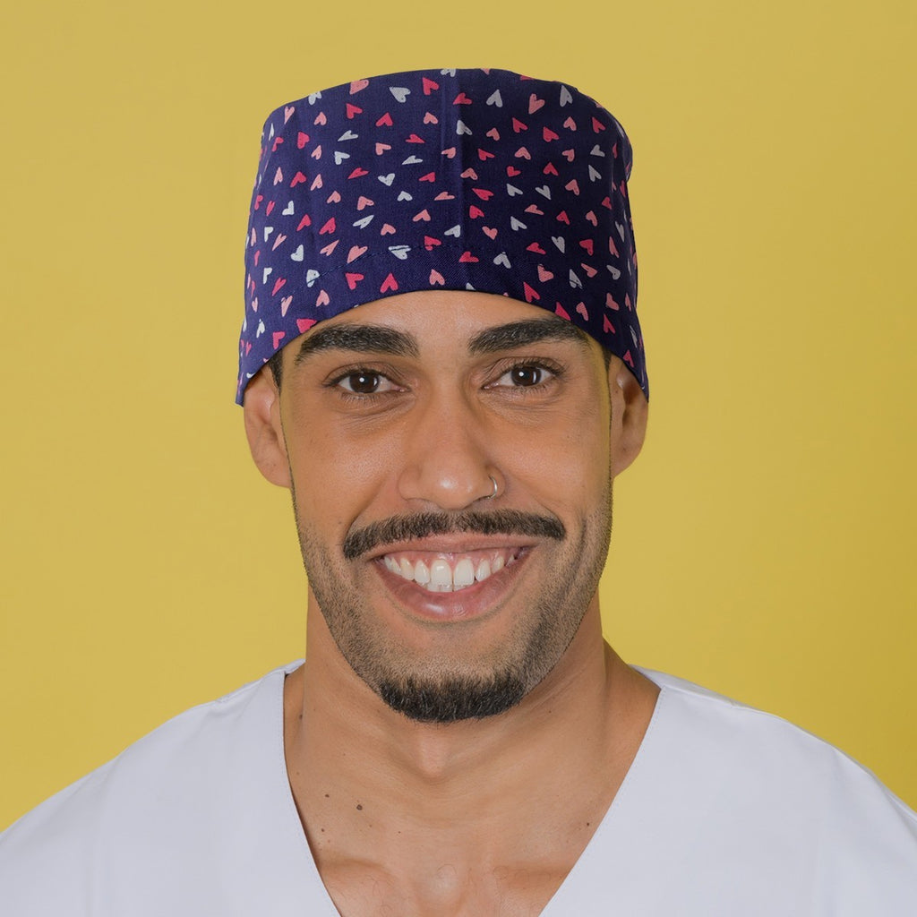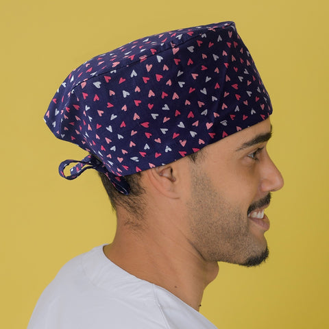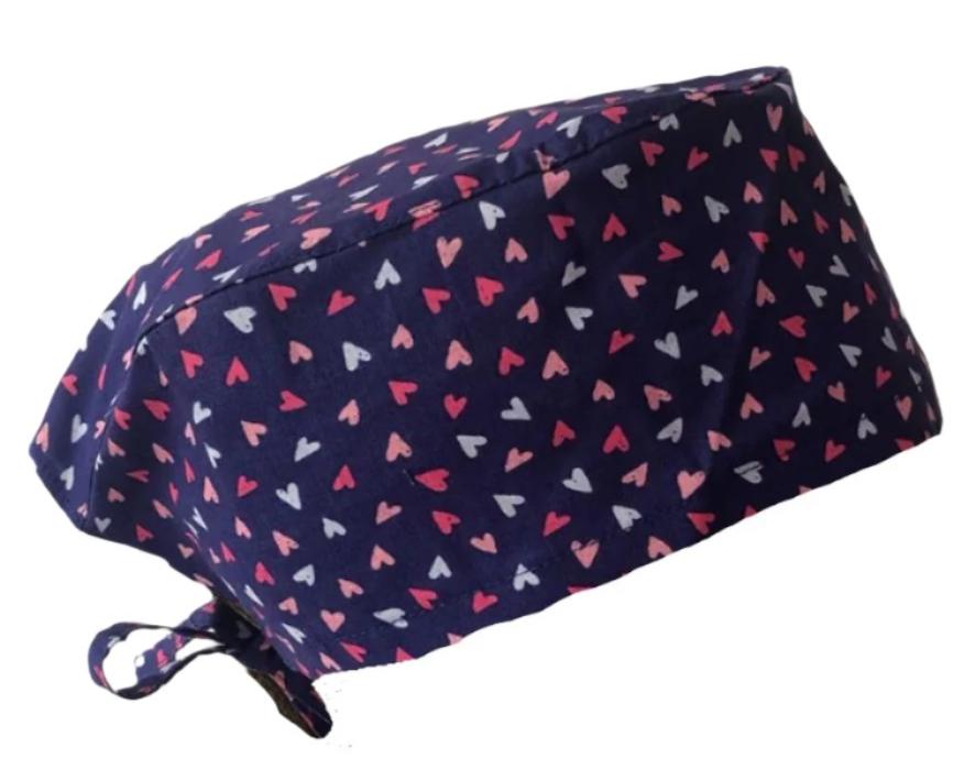 This surgical cap features adjustable laces and printed with coloured hearts in navy blue, perfect for those with shorter hair. The back ribbons add an extra touch of style and function.