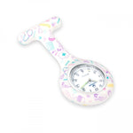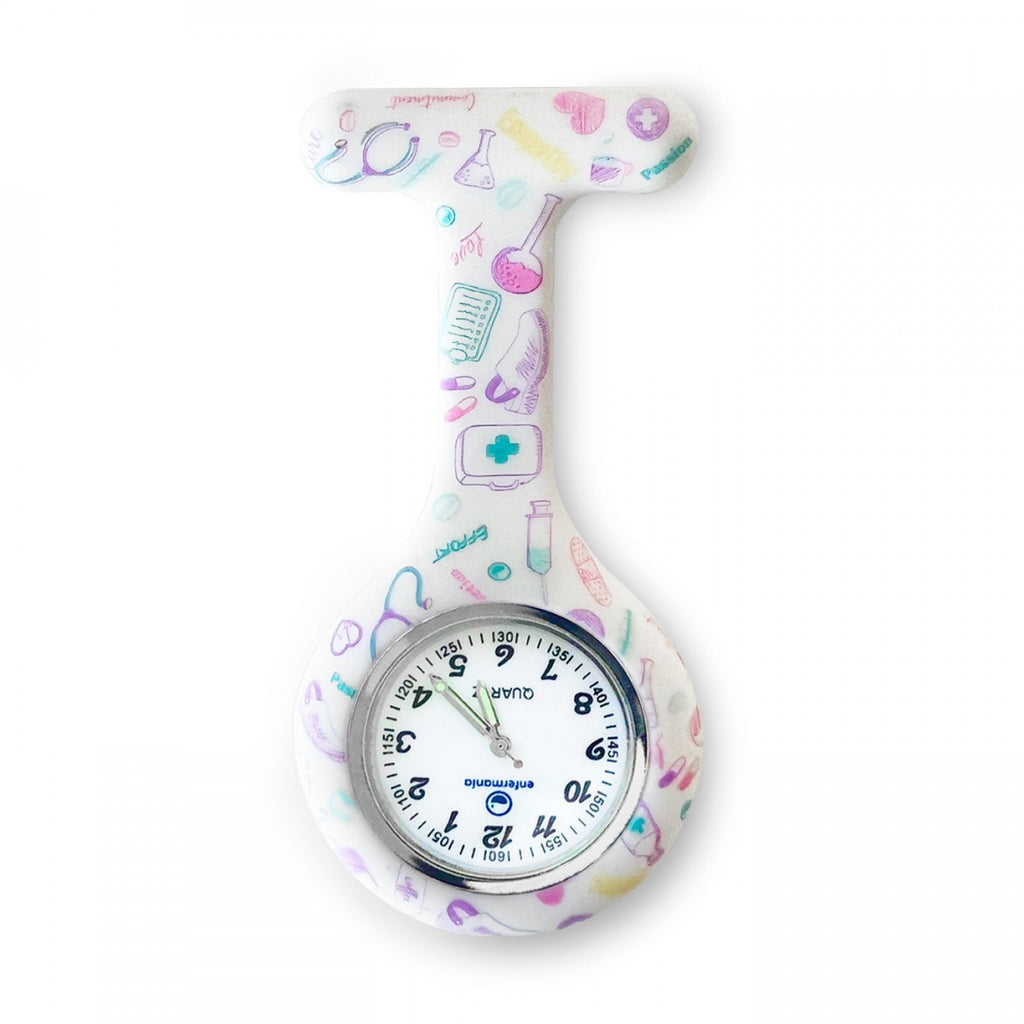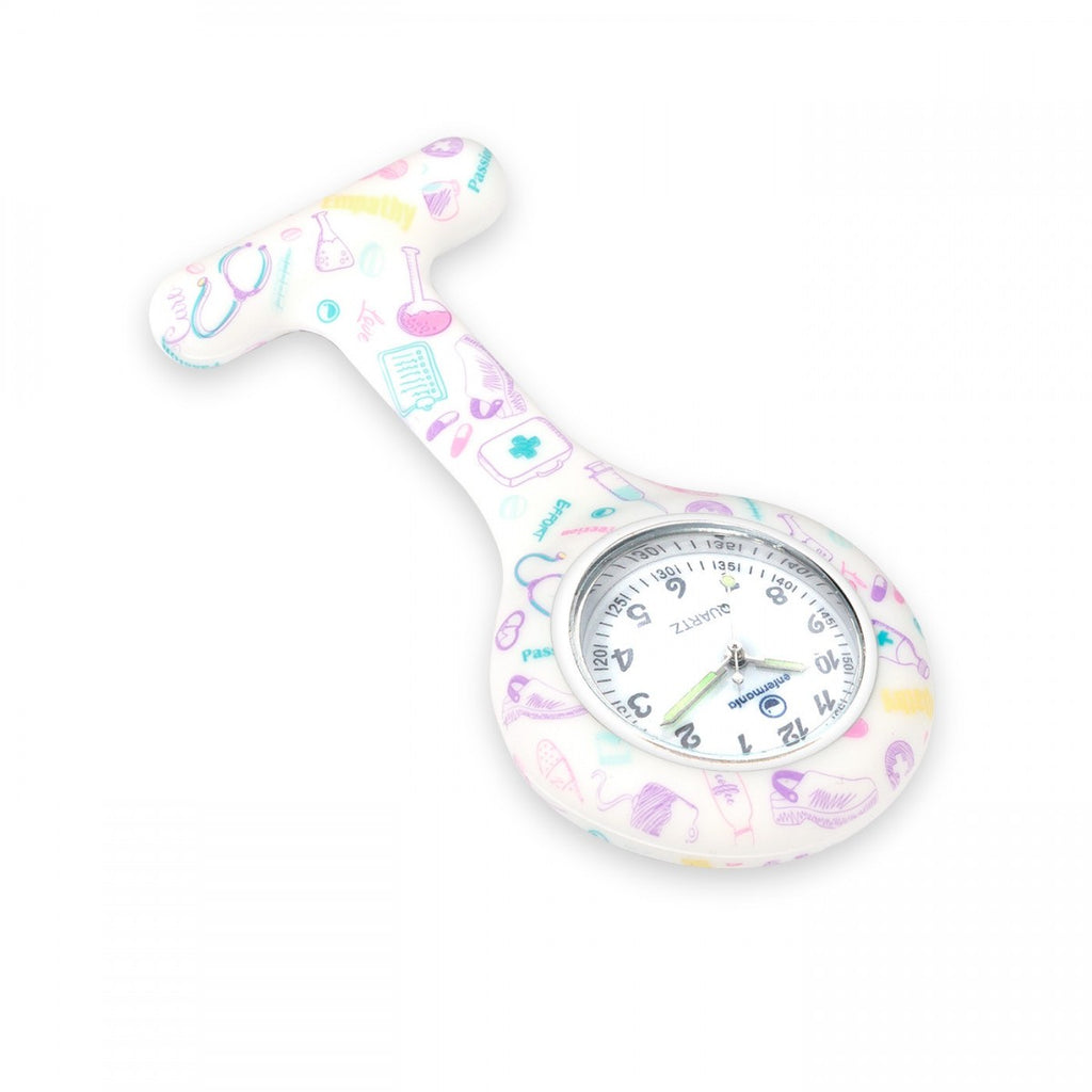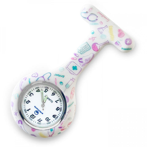 This Silicone Nurse Fob Watch from the White Purple Care Collection is powered by Quartz Machinery and comes with a Brooch for easy attachment. Its White Purple medical print design and glow-in-the-dark feature make it a stylish choice. The fob watch's interchangeable cover adds versatility and functionality.