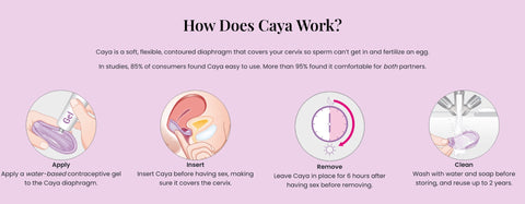 The Caya® is inserted into the vagina before sexual intercourse. It covers the cervix completely and is located between the posterior vaginal vault and the niche on the pubic bone. During and after sexual intercourse, the Caya® prevents sperm from entering the uterus. After intercourse, the Caya® diaphragm must remain in the vagina for at least 6 hours.