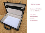 • The briefcase features a sturdy hard handle and a secure hasp closure.