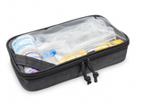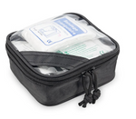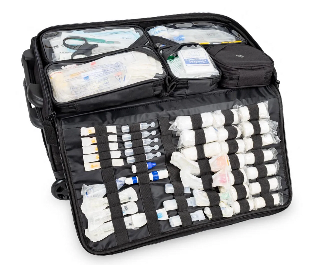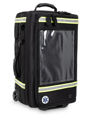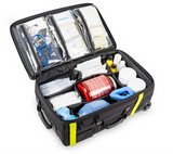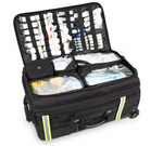 This large medical response bag can be used as a backpack, it can be towed on its built-in wheels or it can be carried conventionally by either of its two ergonomic handles. The medical backpack features a concealed shoulder strap system to avoid snagging when not in use. Likewise, the telescoping handle can be tucked away neatly in a side pocket when not required. The bag opens like a clam shell, allowing instant access to the main compartment and the three transparent, zippered compartments. The bag also features an outside pocket with 4 quick-release, colour-coded equipment pouches with transparent windows to allow easy identification of the contents, and on the other side you will find elasticated loops on an equipment board to secure your smaller supplies.