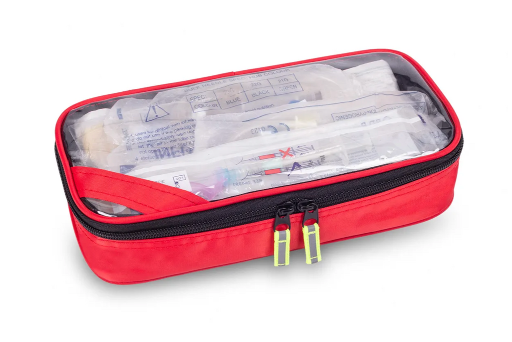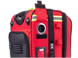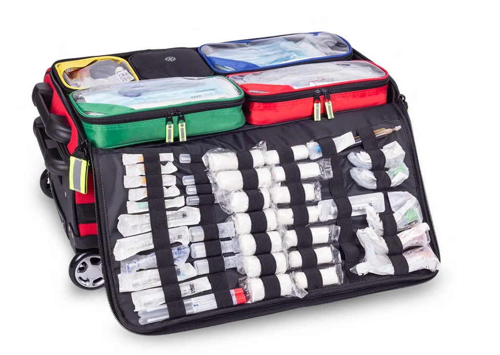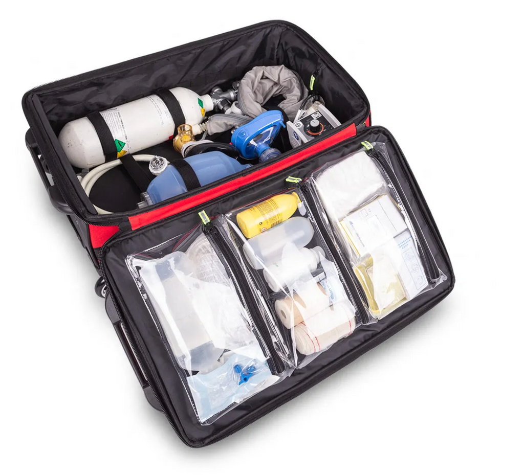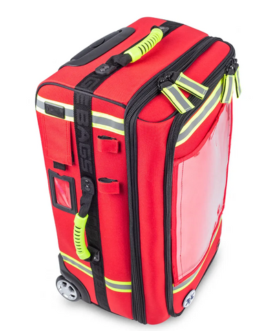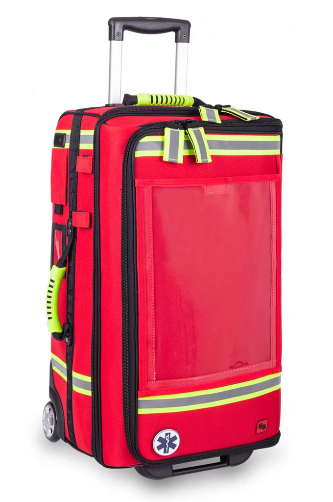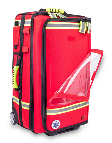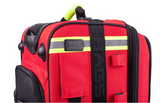 This large medical response bag can be used as a backpack, it can be towed on its built-in wheels or it can be carried conventionally by either of its two ergonomic handles. The medical backpack features a concealed shoulder strap system to avoid snagging when not in use. Likewise, the telescoping handle can be tucked away neatly in a side pocket when not required. The bag opens like a clam shell, allowing instant access to the main compartment and the three transparent, zippered compartments. The bag also features an outside pocket with 4 quick-release, colour-coded equipment pouches with transparent windows to allow easy identification of the contents, and on the other side you will find elasticated loops on an equipment board to secure your smaller supplies.