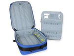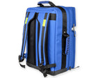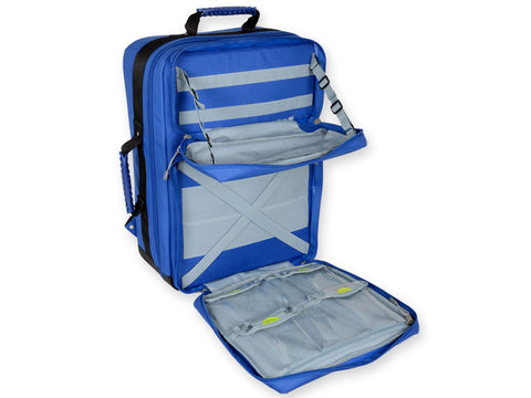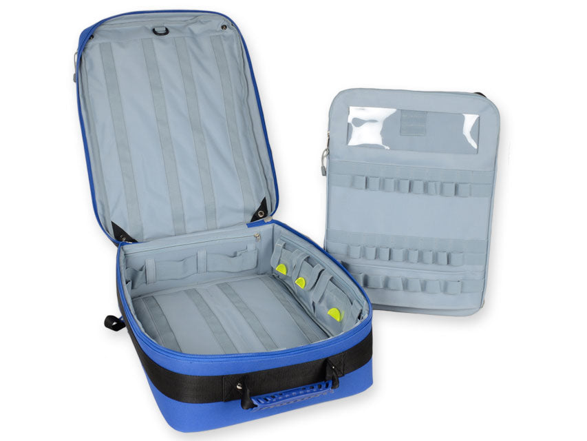 The Emergency Rucksack Medical Bag Blue is a durable and water resistant rucksack made of 600D polyester PVC coated material. It features a removable compartment with 4 transparent pockets and several elastic strips, as well as a central storage space with 3 pockets, velcro strips, and elastic strips. Additionally, there are two external pockets with elastic strips and velcro strips, one measuring 35x16 cm and one measuring 35x32 cm, each with 4 internal transparent pockets. The rucksack also has a rubber bottom with 4 feet, two removable external plates for printing names, and comfortable back shoulder straps and plastic handles on both sides.