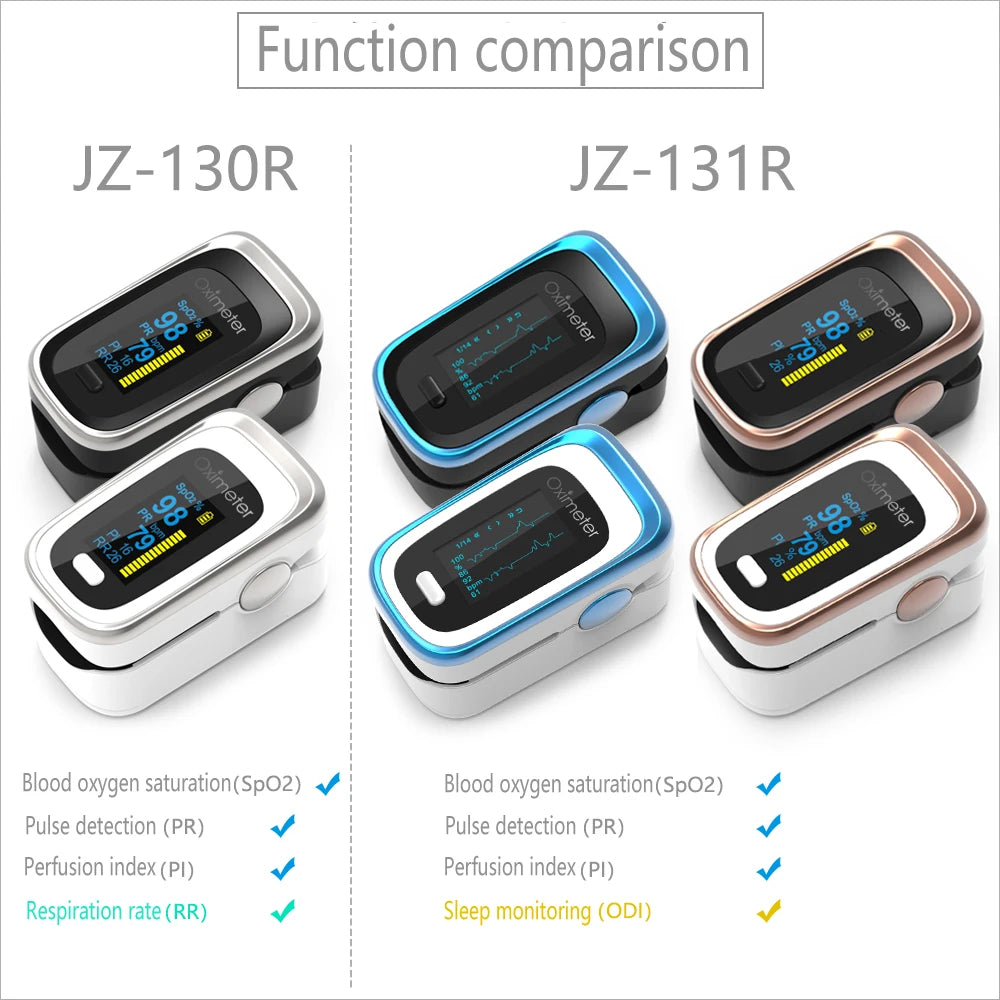 JZ-131R  is equipped with OLED technology and provides measurements for SPO2, PR, PI, and ODI. It also features an ODI Index and Pl perfusion index for accurate readings of blood oxygen saturation and pulse. The display is OLED and can be adjusted for brightness, with a warning buzzer for alerts. The metal paint process adds a touch of longevity and durability to this device.