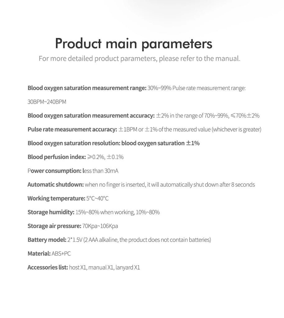 • Blood oxygen saturation measurement accuracy: ±2% in the range of 70%~99%,≤70%±2%.