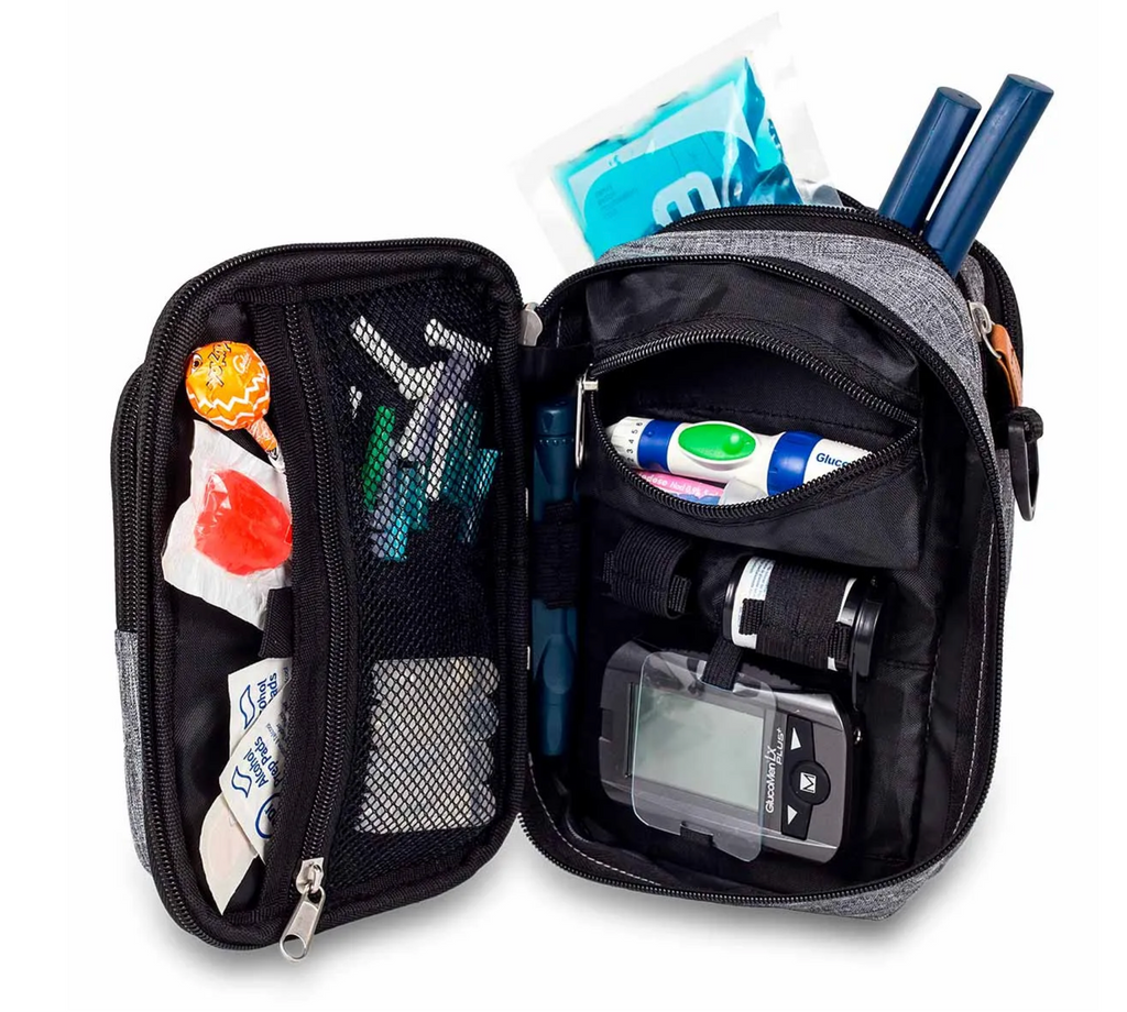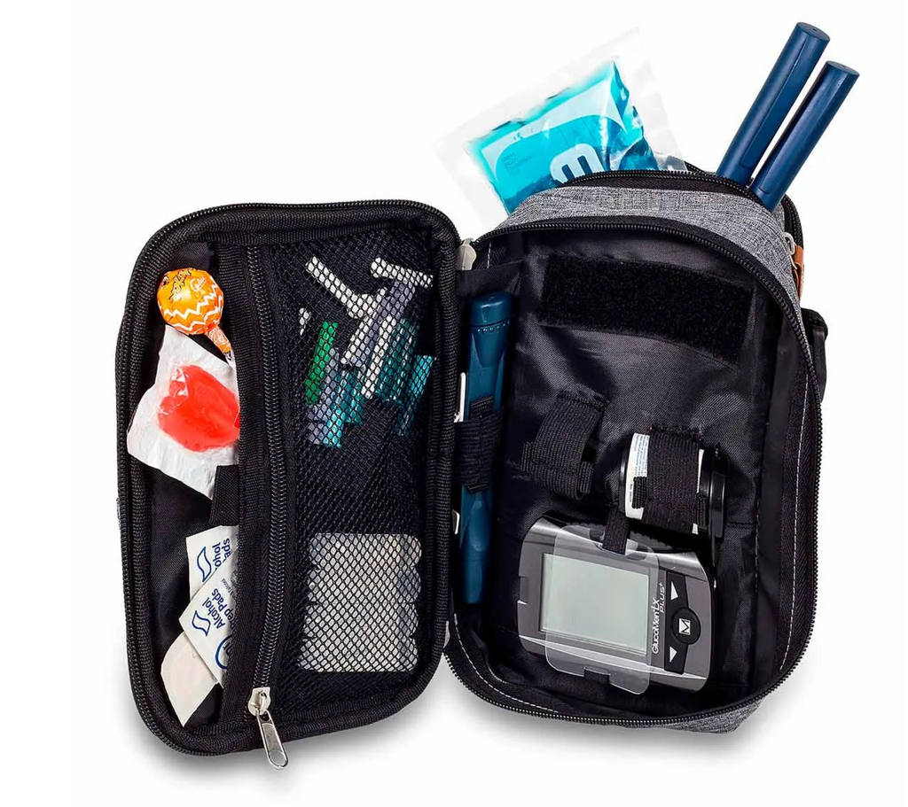 Mesh pockets make perfect storage areas for swabs, needles and similar materials, while internal elasticated loops are laid out specifically to retain insulin pens, glucometers and test strip bottles.