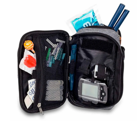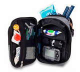- Dedicated elasticated retainers for glucometer, test strip bottle and insulin pens.