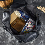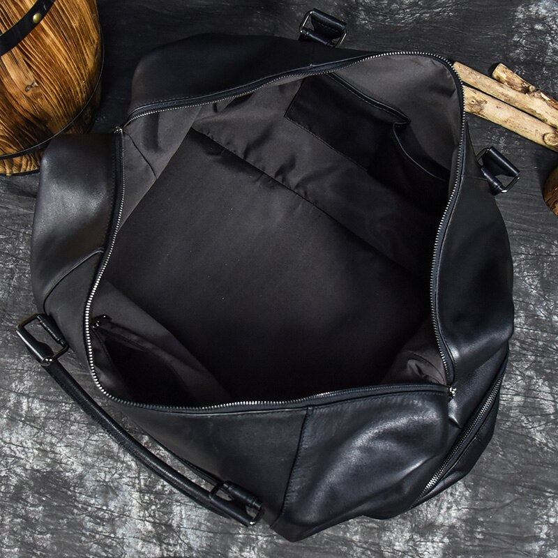 This duffle bag features a soft texture and is secured with a zipper closure.