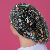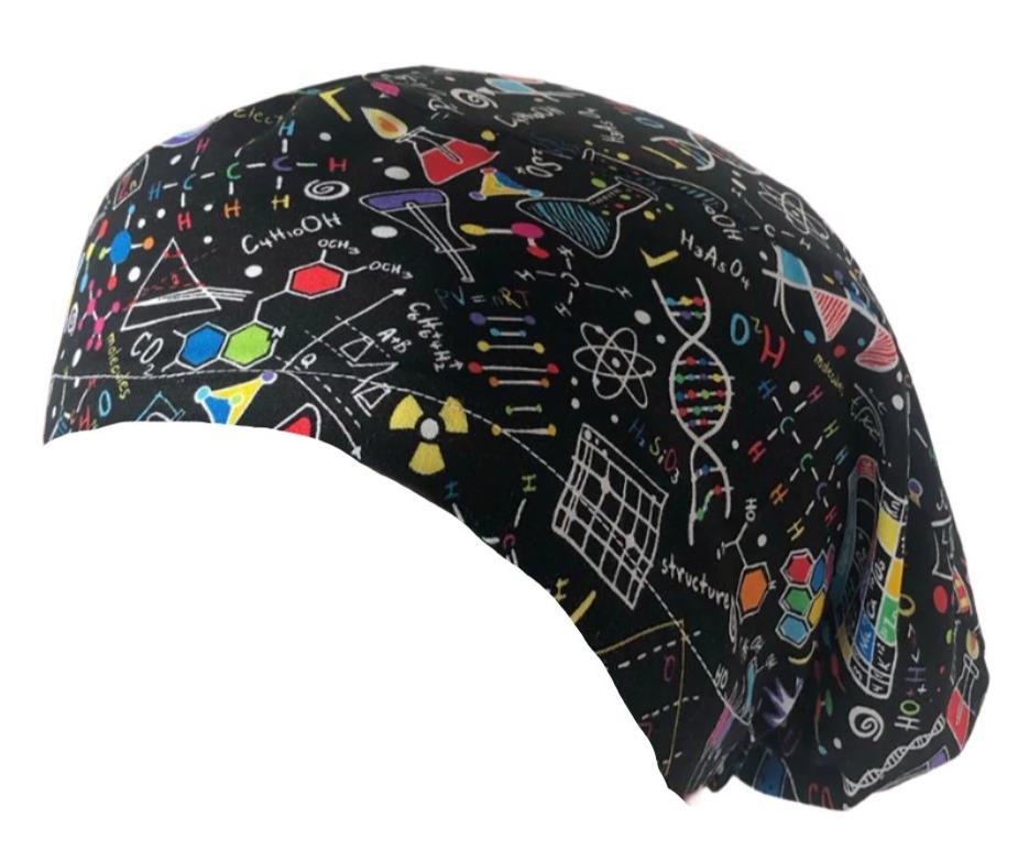 This surgical cap is specifically designed for individuals with long hair, featuring an elastic band at the back for a comfortable fit. The chemistry design add a touch of style to this functional product.